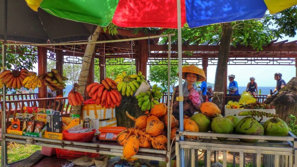 Tropical fruits abound – juicy mangoes, pineapples, papayas. Herbs like lemongrass and lime leaves infuse dishes with brightness. Desserts like qingbuliang—a refreshing blend of jelly, mung beans, and coconut milk—offer the perfect cool-down after a sunny day’s ride. Even drinks are part of the experience—try fresh coconut water straight from the shell.